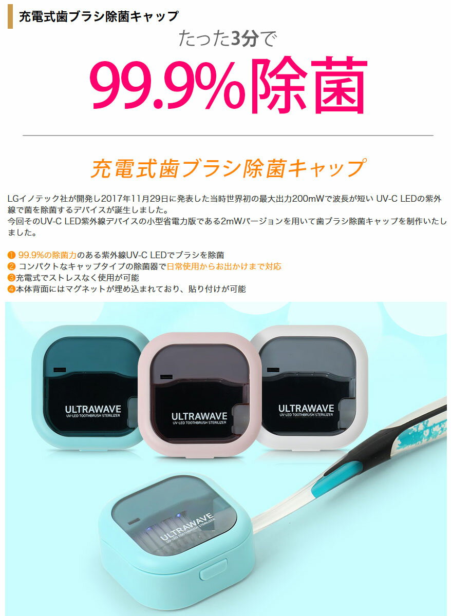 ●99.9%の除菌力のある紫外線UV-C LEDでブラシを除菌 ●コンパクトなキャップタイプの除菌器で日常使用からお出かけまで対応 ●充電式でストレスなく使用が可能 ●本体背面にはマグネットが埋め込まれており、貼り付けが可能MEDIK MDK-TS03-PK 歯ブラシ除菌器(ピンク) メディク 殺菌能力高い紫外線LED UV-Cを採用した確実安全な除菌器MDK-TS03! ご注意:ゆうパケット(ポスト投函)にて発送致します。